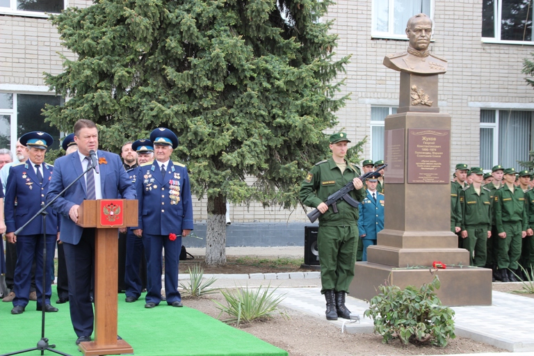 Право открыть бюст четырежды Герою Советского Союза, маршалу Жукову Георгию Константиновичу было предоставлено главе Ейского района Юрию Келембет и заместителю руководителя краснодарского краевого отделения ВООВ «Боевое братство», Герою Советского Союза полковнику Григорию Хаустову. В торжественной церемонии открытия бюста великому полководцу приняли участие руководитель Краснодарского краевого отделения Всероссийской общественной организации ветеранов полковник Валерий Ярко, руководитель благотворительного фонда имени Героя Российской Федерации Геннадия Трошева Наталья Белокобынцева, депутаты Совета МО Ейский район, ветераны Великой Отечественной войны и военной службы, представители духовенства, заместитель председателя Местного отделения ДОСААФ России Щербиновского района Краснодарского края, коллектив Щербиновского отделения Всероссийской общественной организации ветеранов боевых действий «Боевое Браство», общественность.