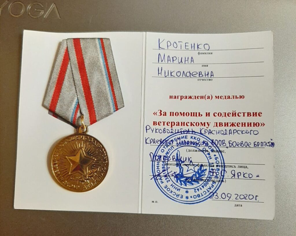 26 февраля 2021 года в Краснодарском краевом отделении Всероссийской общественной организации ветеранов «БОЕВОЕ БРАТСТВО» исполняющему обязанности председателя Местного отделения ДОСААФ России Щербиновского района Краснодарского края Марине Кротенко вручена медаль за помощь и содействие ветеранскому движению, Медаль вручил руководитель Краснодарского краевого отделения ВООВ «БОЕВОЕ БРАТСТВО», ветеран боевых действий, полковник Валерий Ярко.