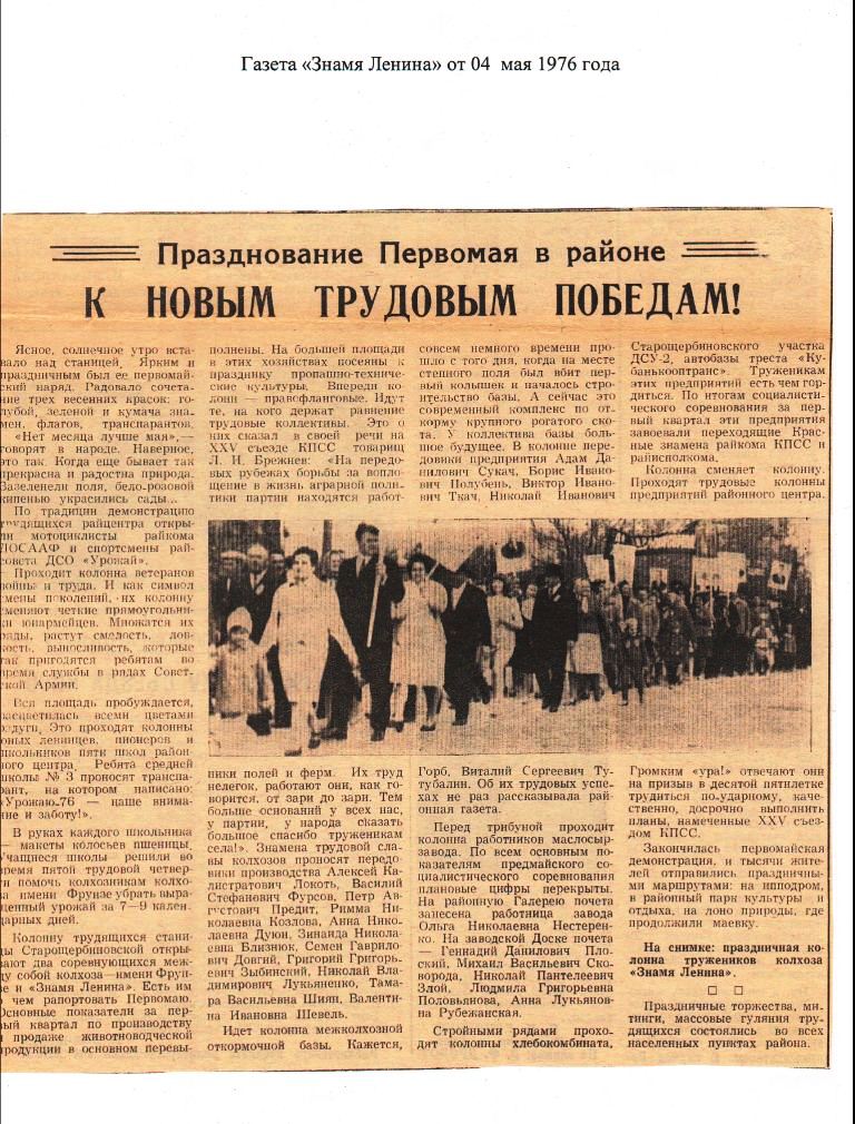 1 мая в центре станицы Старощербиновской прошло уже традиционное Первомайское шествие. В почётном президиуме – глава района Сергей Юрьевич Цирульник, председатель Совета муниципального образования Щербиновский район М.Н.Кряжов, заместители главы С.В. Плахотный, О.В. Лунева, А.Н. Ефремов, ветераны ВОВ и труда, труженики тыла.