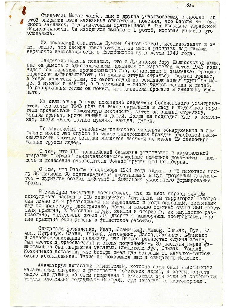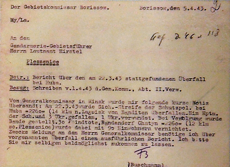 Село Хатынь в Беларуси уничтожили не немцы, а специальная зондеркоманда (118-й полицейский батальон), которая состояла в подавляющем большинстве из полицаев-украинцев. Командовал батальоном, бывший польский майор Смовский, начальник штаба — бывший старший лейтенант Красной Армии Григорий Васюра, командир взвода — бывший лейтенант Красной Армии Василий Мелешко. Немецким «шефом» 118-го вспомогательного батальона был майор полиции Эрих Кернер.