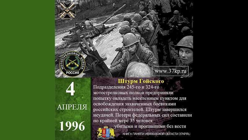 Подразделения 245-го и 324-го мотострелковых полков предприняли попытку овладеть населённым пунктом для освобождения захваченных боевиками российских строителей. Штурм завершился неудачей. Потери федеральных сил составили, по крайней мере, 49 человек убитыми и пропавшими без вести.