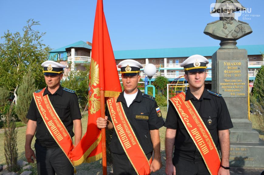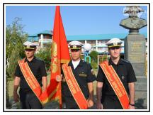 Возле памятника почетным караулом встала знаменная группа Центра морской авиации г. Ейска.