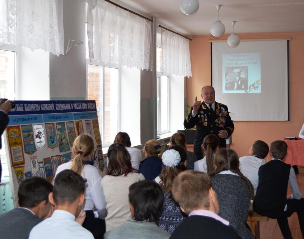 Сегодня отнюдь не случайно большое внимание в общеобразовательных учреждениях уделяется патриотическому воспитанию. В зарубежных СМИ зачастую преподносится искажённая информация об истинных героях Великой Отечественной войны, победивших фашизм. Поэтому встречи с ветеранами, уроки мужества в современных школах - это путь к постижению исторической правды и уважения к памяти тех, кто ценой жизни, ценой неимоверных усилий завоевал для нас мир и свободу. Задача Урока Мужества, познакомить учащихся с Георгием Михайловичем Егоровым, советским флотоводцем, начальником Главного штаба Военно – Морского флота СССР, Героем Советского Союза, Адмиралом флота, была выполнена. На экране кинопроектора кинофрагменты военной хроники похода подводной лодки сменились презентацией об Адмирале Егорове.