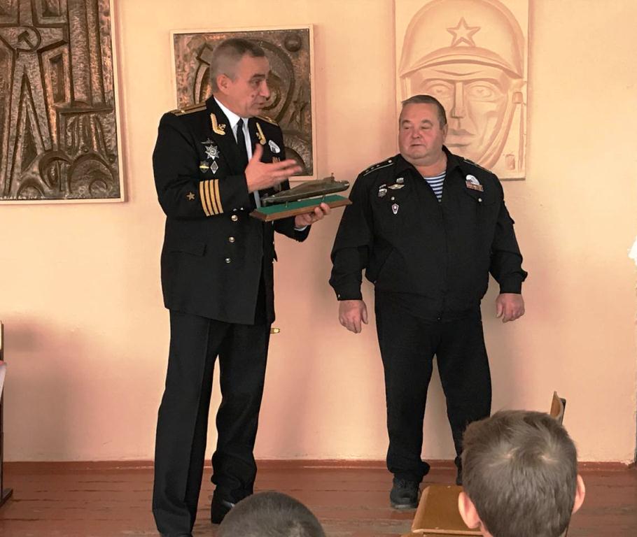 Попов Николай Васильевич, старший мичман, боцман подводной лодки Тихого океана, показал детям фотографию своей подводной лодки, рассказал, как новичков принимают в подводники, о том, что и на подлодках отмечают День Нептуна.