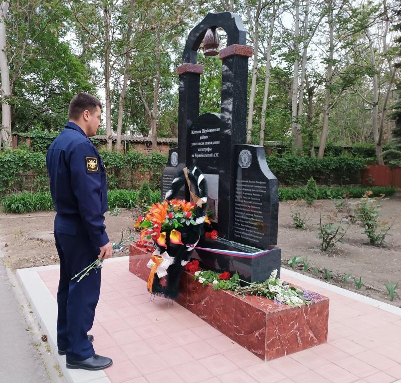 В этот день к памятнику ликвидаторам последствий аварии на Чернобыльской АЭС принес цветы председатель Местного отделения ДОСААФ Щербиновского района Александр Даценко.