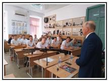 Михаил Николаевич поздравил курсантов с 80 годовщиной Победы в ВОВ, рассказал о ветеранах ВОВ ст. Старощербиновской, о первом Герое Советского союза, нашем земляке А.В. Ляпидевском.