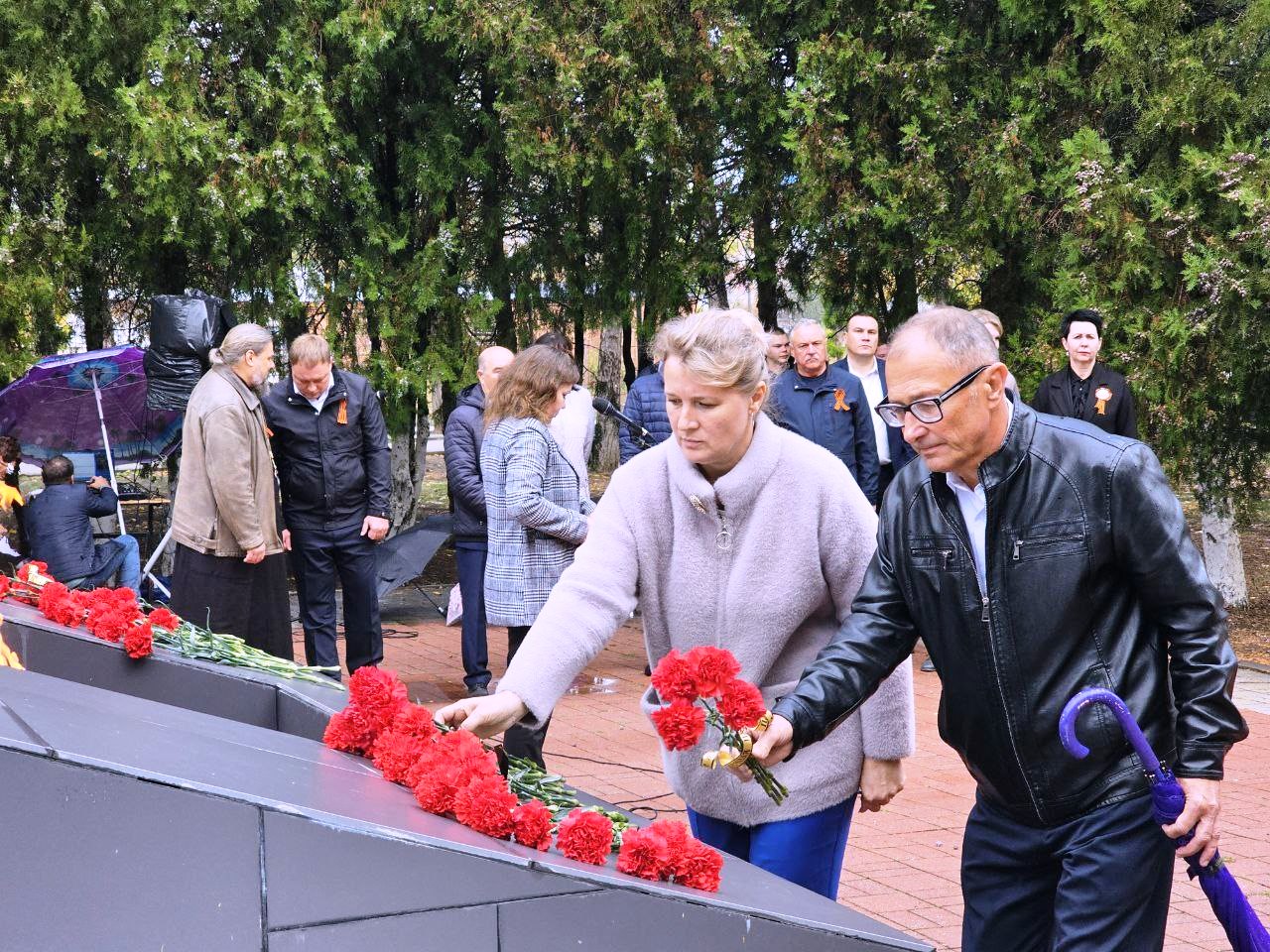В память о тех, кто отдал свои жизни во имя Победы, была объявлена минута молчания, возложены живые цветы к Вечному огню, и корзины цветов к памятникам труженикам тыла и расстрелянным мирным жителям в период оккупации Щербиновского района.