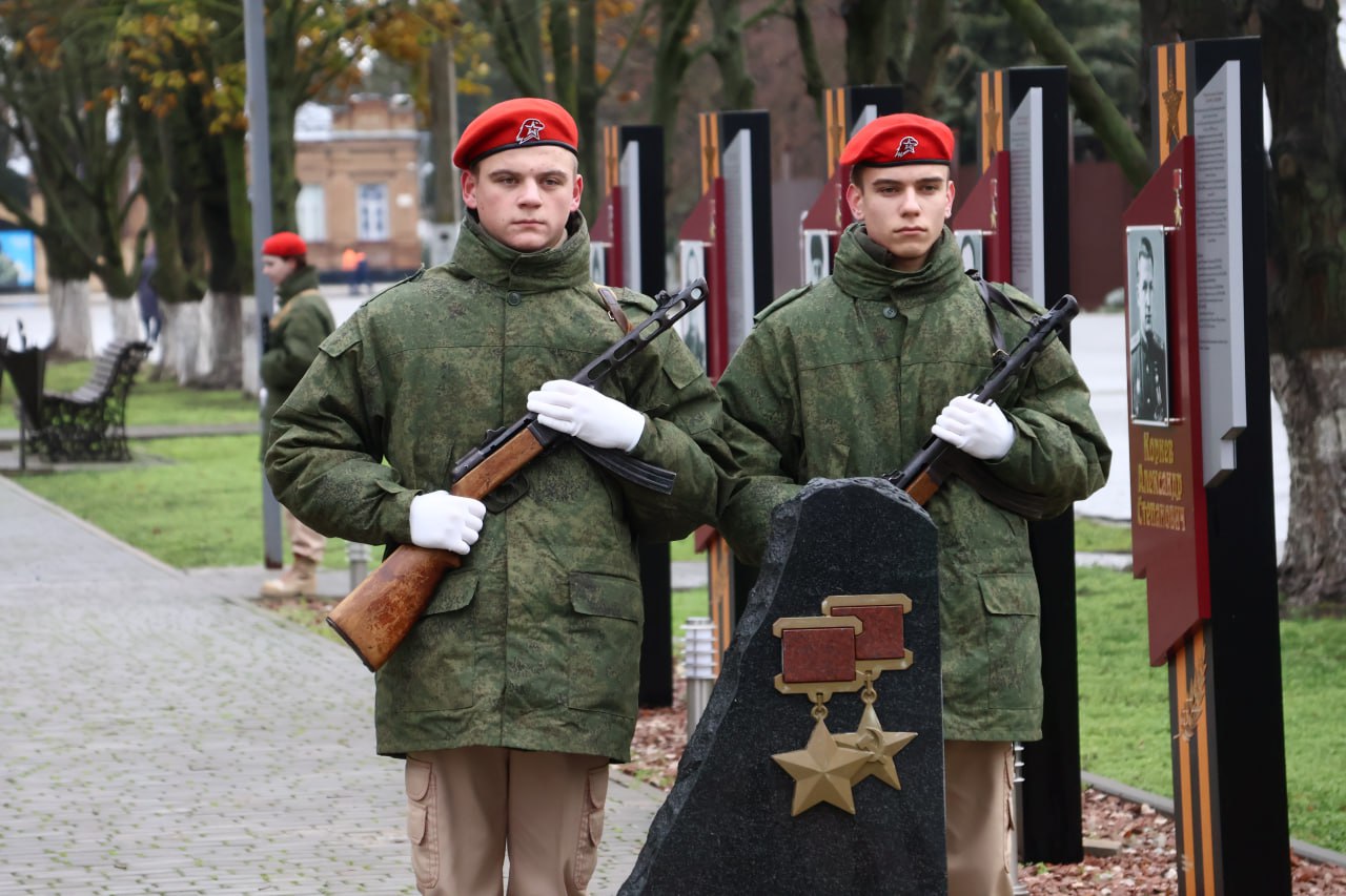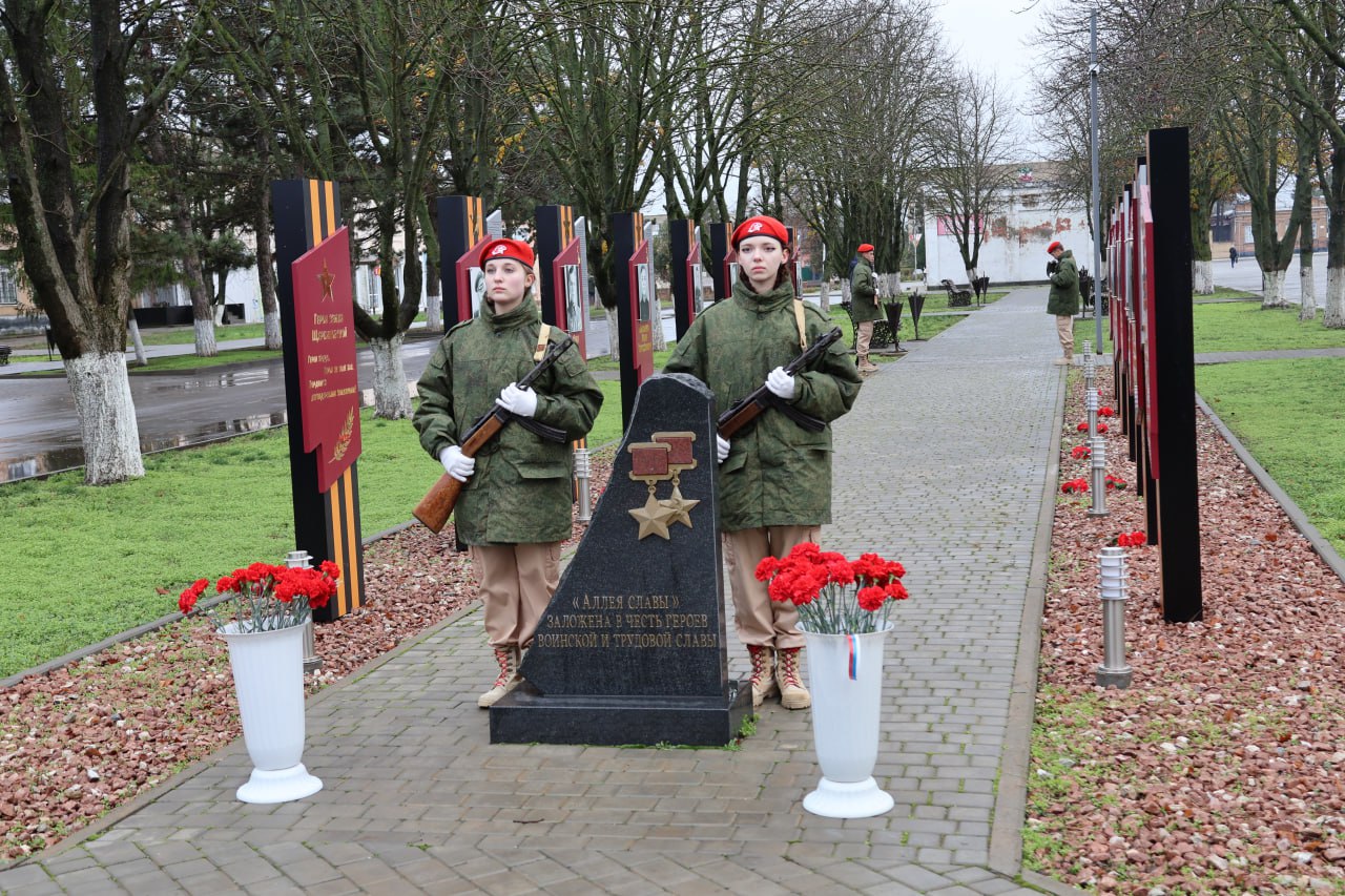 Сегодня на Аллее боевой и трудовой Славы в станице Старощербиновской состоялся торжественный митинг, посвящённый Дню Героев Отечества.
