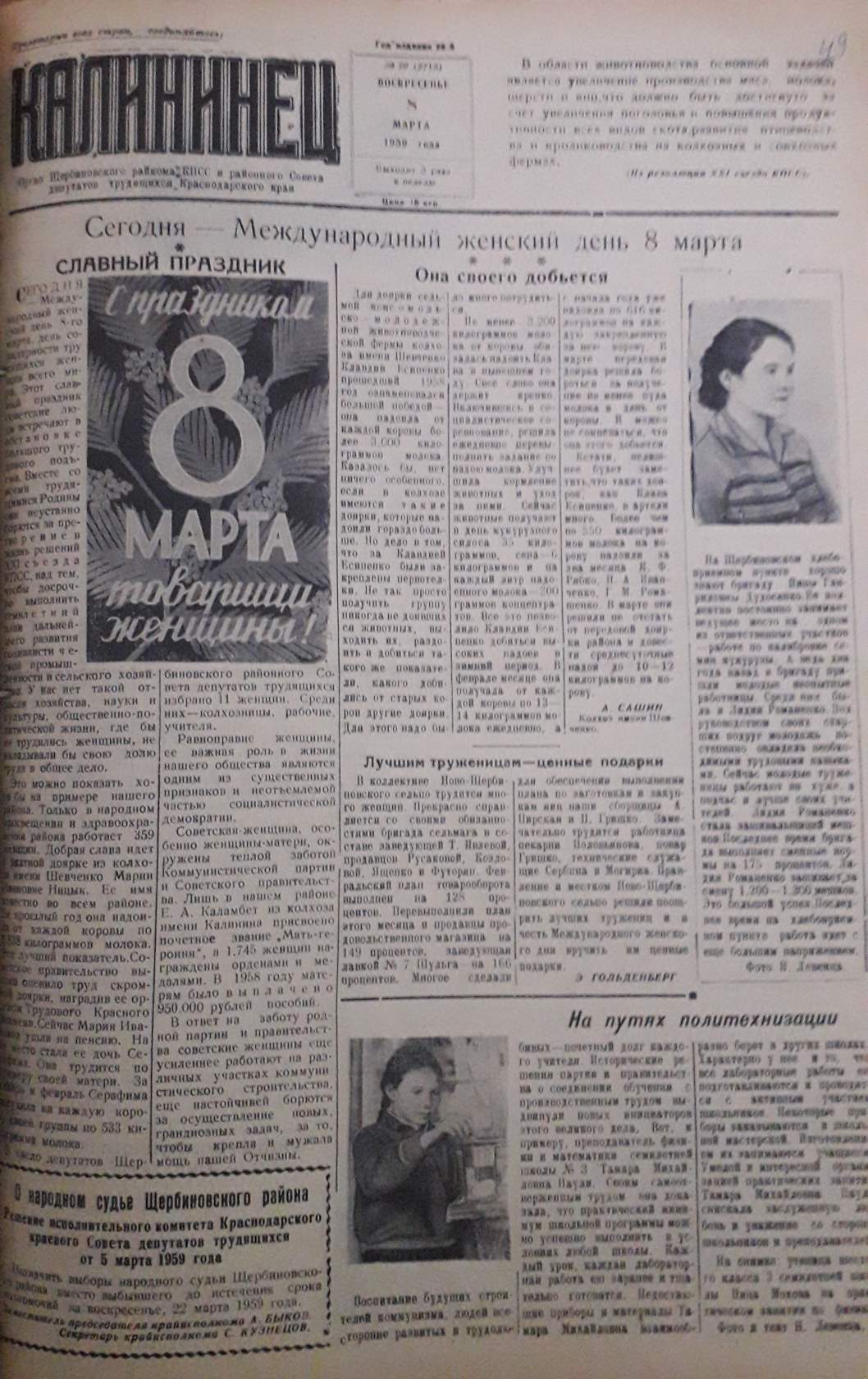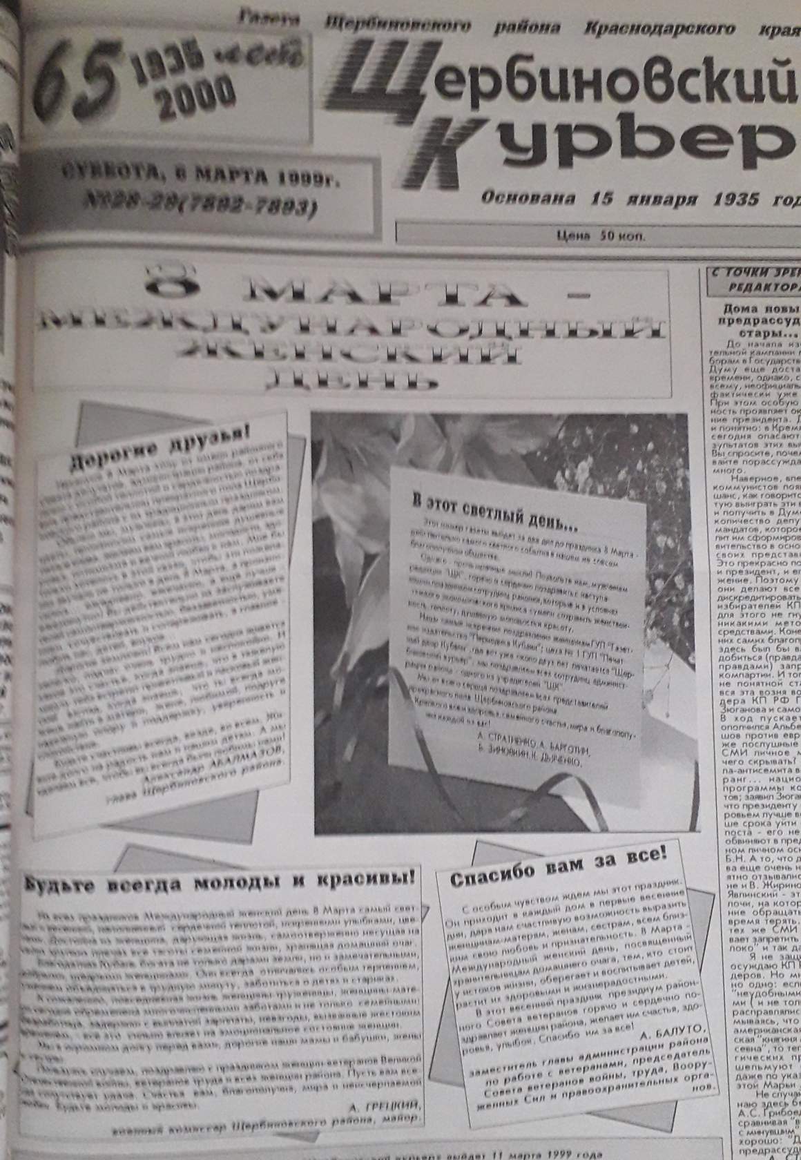 8 марта 2019 года в Старощербиновском сельском поселении Щербиновского района с самого раннего утра царила праздничная атмосфера. На центральной площади станицы звучали любимые песни, посвященные прекрасной половине человечества. В фойе МБУК «Центр народного творчества» была представлена выставка «Весенний вернисаж», где мастерицы демонстрировали свои любимые увлечения. Со словами добрых пожеланий ко всей прекрасной половине обратился глава Старощербиновского сельского поселения Владимир Григорьевич Подолянко. Затем состоялся праздничный концерт «Ее величество – женщина». В программе приняли участие творческие коллективы МБУК ЦНТ. В финале праздника мужчины подарили присутствующим женщинам цветы, а ведущие пожелали всем любви, счастья, мира и добра.