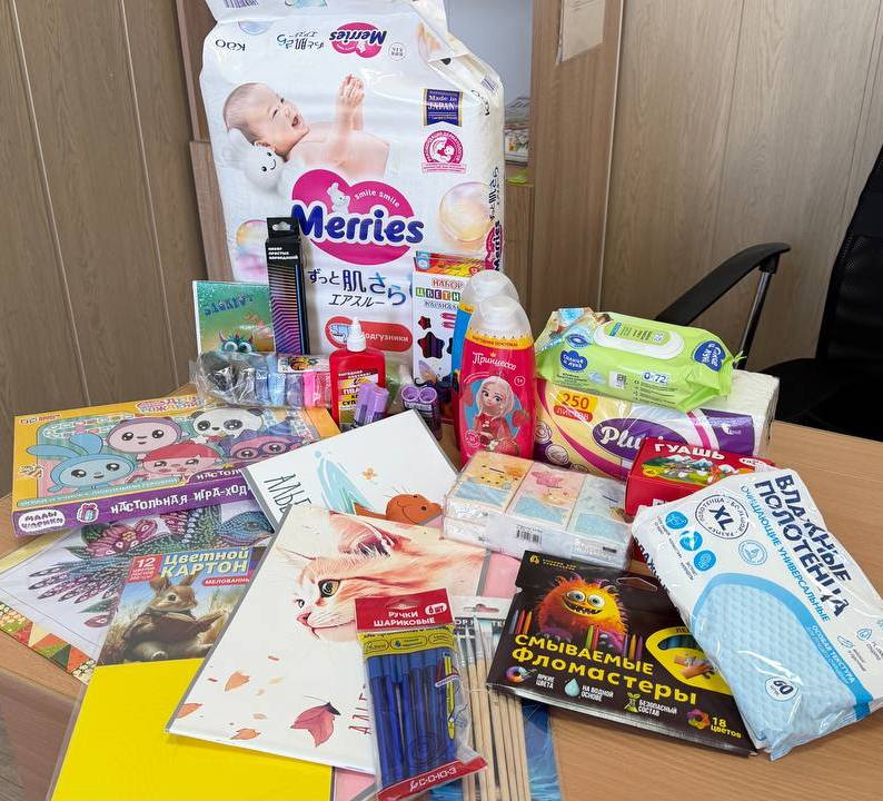 Мы закупили: памперсы, детские шампуни, влажные и обычные салфетки, наборы для творчества, кисти, фломастеры, маркеры, альбомы, картон, настольную игру, карандаши, гуашь и еще много всяких нужных мелочей.