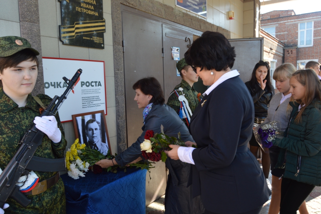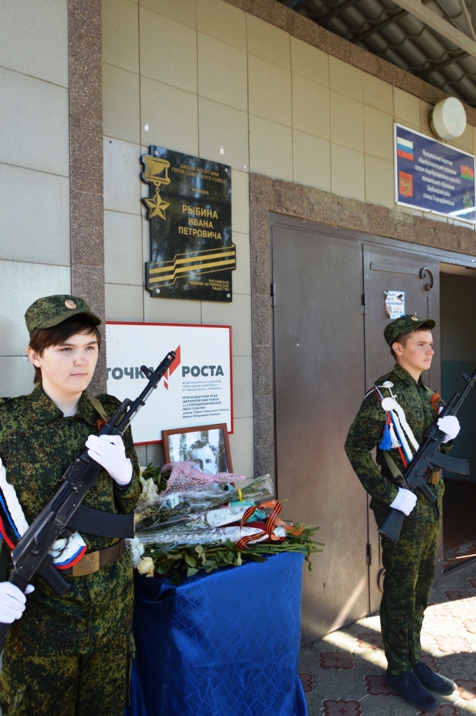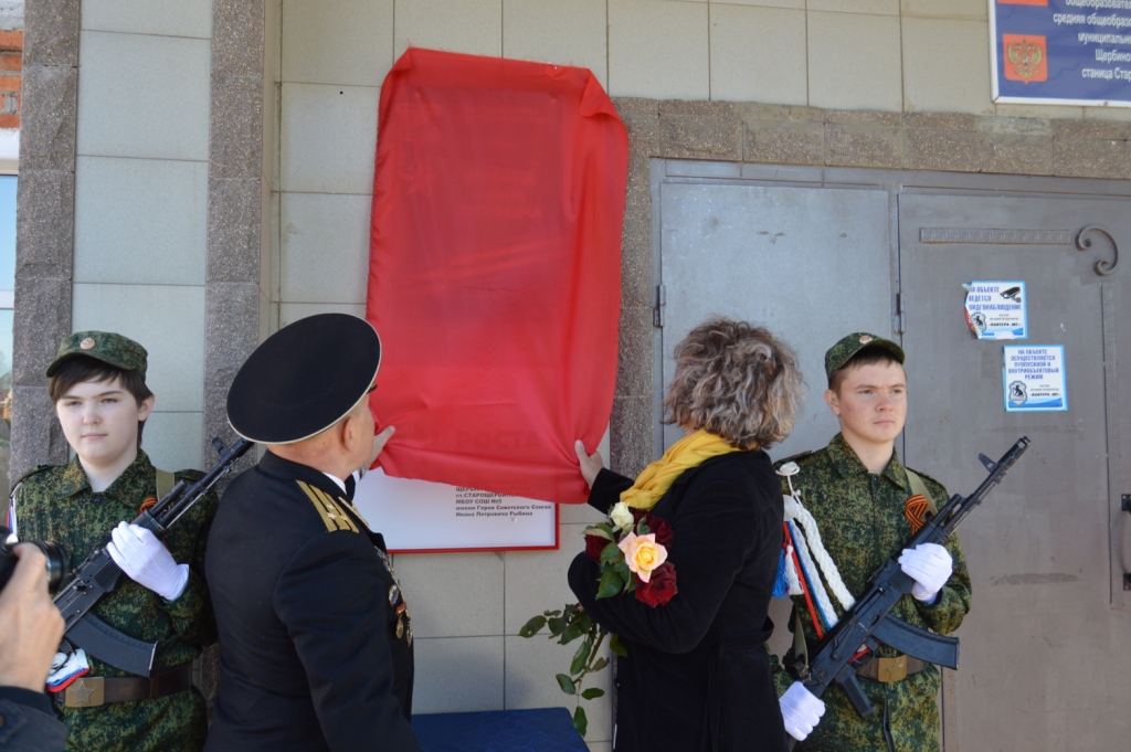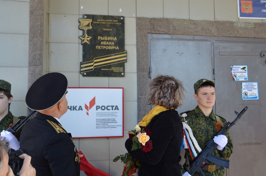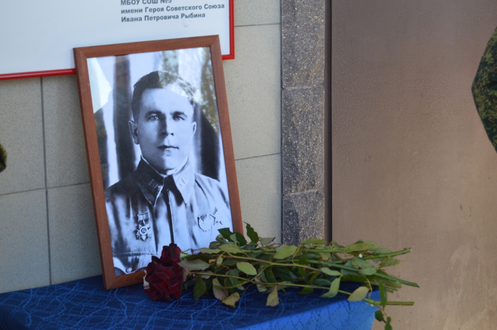 Торжественная линейка, прошедшая 9 октября 2019 года в МБОУ СОШ № 5 станицы Старощербиновской, была особенной. В этот день на стене у главного входа в образовательное учреждение появилась памятная доска в честь Героя Советского Союза, летчика – истребителя Ивана Петровича Рыбина, погибшего в воздушных боях над Краснодаром в апреле 1943 года.