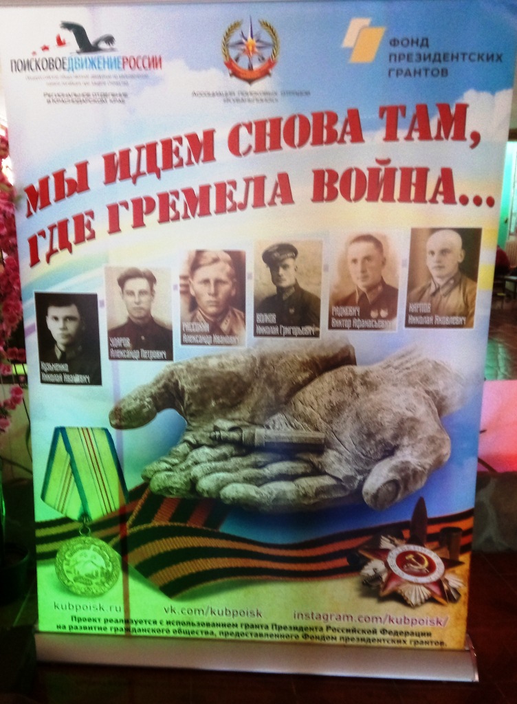 Краснодарской краевой общественной военно-патриотической поисковой организацией «Ассоциация поисковых отрядов «Кубаньпоиск» совместно с Региональным отделением Общероссийского общественного движения по увековечиванию памяти погибших при защите Отечества «Поисковые движения России», при содействии общественных поисковых объединений и школьных поисковых отрядов, действующих на территории Краснодарского края, проводится краевая акция по презентации деятельности поисковых организаций «Мы идём снова там, где гремела война…», посвященная Дню Победы в Великой Отечественной войне.