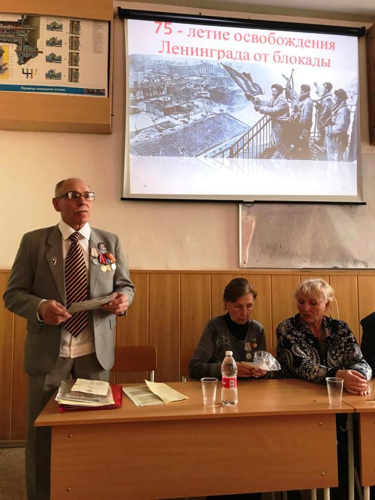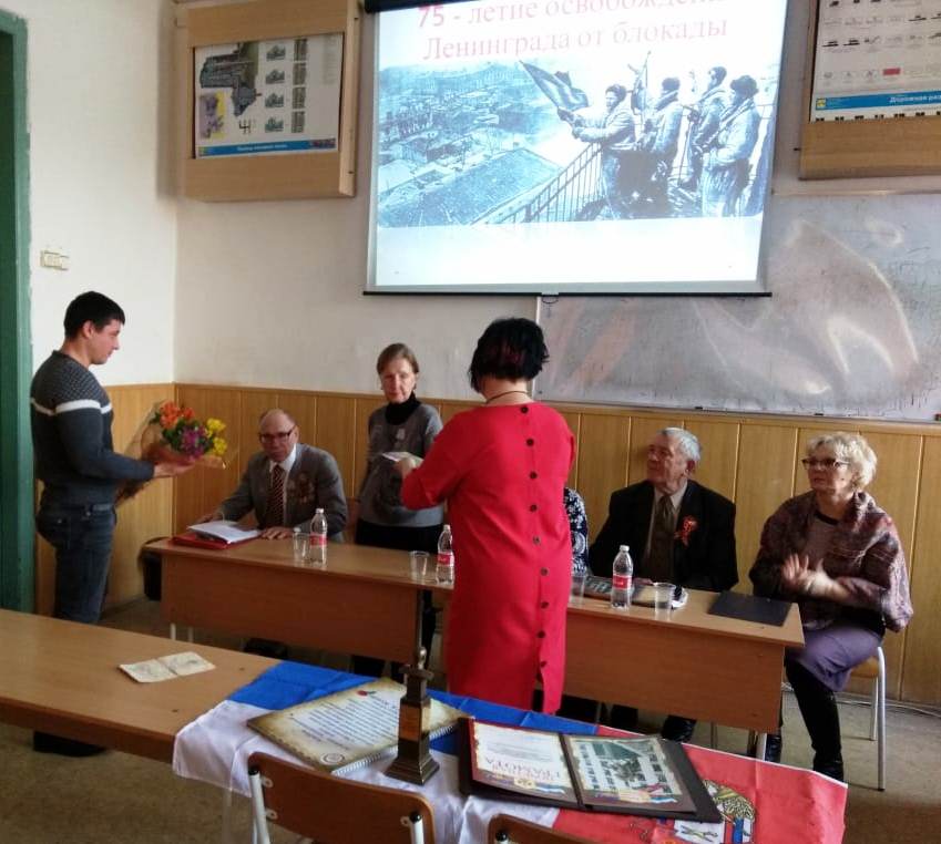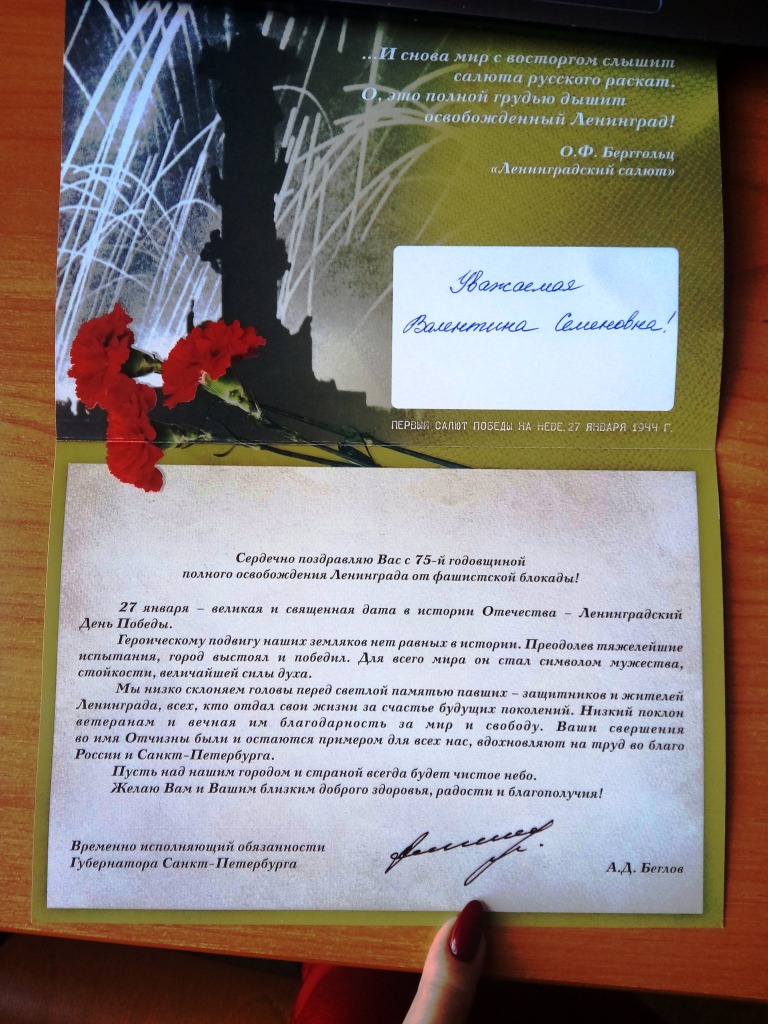 Председатель МО ДОСААФ Александр Даценко поблагодарил почетных гостей и вручил Валентине Семеновне цветы и адресное письмо Врио Губернатора г. Санкт – Петербурга А.Д. Беглова с поздравлением с 75 годовщиной полного освобождения г. Ленинграда от фашистской блокады. Заместитель председателя Марина Кротенко продолжила рассказ словами: …за массовый героизм и мужество в защите Родины в Великой Отечественной войне 1941—1945 годов, проявленные защитниками блокадного Ленинграда, согласно Указу Президиума Верховного Совета СССР 8 мая 1965 года городу присвоена высшая степень отличия — звание Город-герой. 27 января является Днём воинской славы России — День полного освобождения Ленинграда от фашистской блокады (1944 год).