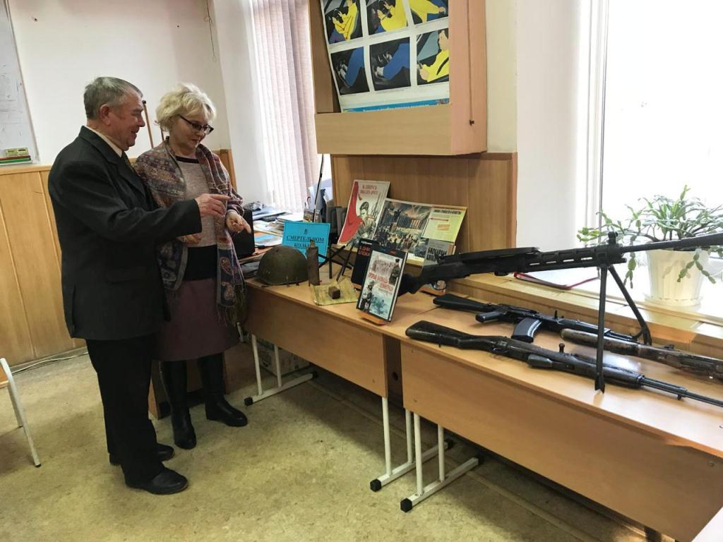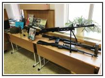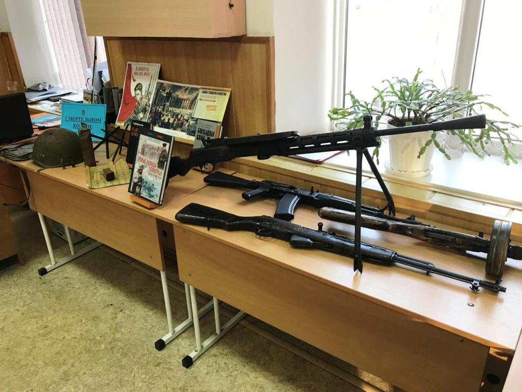 Была оформлена выставка оружия МО ДОСААФ: пулемет системы Дегтярева, автоматы Калашникова, самозарядный карабин Симонова (винтовка СКС), пистолет – пулемет Шпагина (ППШ).
