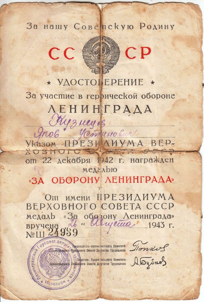 Кузнецов Ю.Я. рассказал о своем отце: «…23 – летний боец Красной Армии 6 – го военно – топографического ордена Красной Звезды отряда, Яков Устинович Кузнецов. Который участвовал в боях на Ленинградском фронте с 1942 по 1944 год. Находясь на переднем крае боевых действий в инженерно – разведывательном взводе, разминировал минные поля, уничтожал проволочные заграждения, огневые точки противника. За участие в героической обороне Ленинграда 26 августа 1943 года Яков Устинович награжден медалью «За оборону Ленинграда».